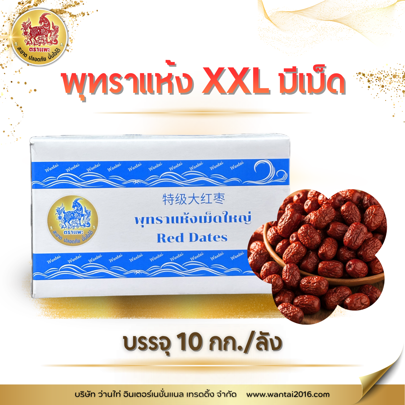 พุทราแห้งตราแพะ XXL บรรจุ 10 กิโลกรัม/ลัง สรรพคุณ: มีวิตามินเอ วิตามินซี ฟอสฟอรัส แคลเซียมสูง เป็นยาบำรุงเลือด บำรุงไต บำรุงกำลัง ลดคอเลสเตอรอลในเลือด ป้องกันโรคความดันโลหิตสูง เลือดแข็งตัว เส้นเลือดเลี้ยงหัวใจตีบตัน เป็นยาบำรุงประสาท แก้โรคนอนไม่หลับ วิธีใช้ :เราจะเห็นบางเมนูก็ใส่พุทราจีนในการต้มน้ำซุปให้มีความหวานที่ธรรมชาติ และเมนูของหวานหลากหลายเมนูก็มีพุทราจีนเป็นส่วนประกอบเช่นกัน