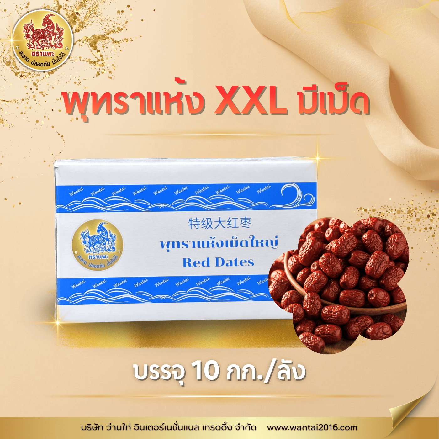 พุทราแห้งตราแพะ XXL บรรจุ 10 กิโลกรัม/ลัง สรรพคุณ: มีวิตามินเอ วิตามินซี ฟอสฟอรัส แคลเซียมสูง เป็นยาบำรุงเลือด บำรุงไต บำรุงกำลัง ลดคอเลสเตอรอลในเลือด ป้องกันโรคความดันโลหิตสูง เลือดแข็งตัว เส้นเลือดเลี้ยงหัวใจตีบตัน เป็นยาบำรุงประสาท แก้โรคนอนไม่หลับ วิธีใช้ :เราจะเห็นบางเมนูก็ใส่พุทราจีนในการต้มน้ำซุปให้มีความหวานที่ธรรมชาติ และเมนูของหวานหลากหลายเมนูก็มีพุทราจีนเป็นส่วนประกอบเช่นกัน