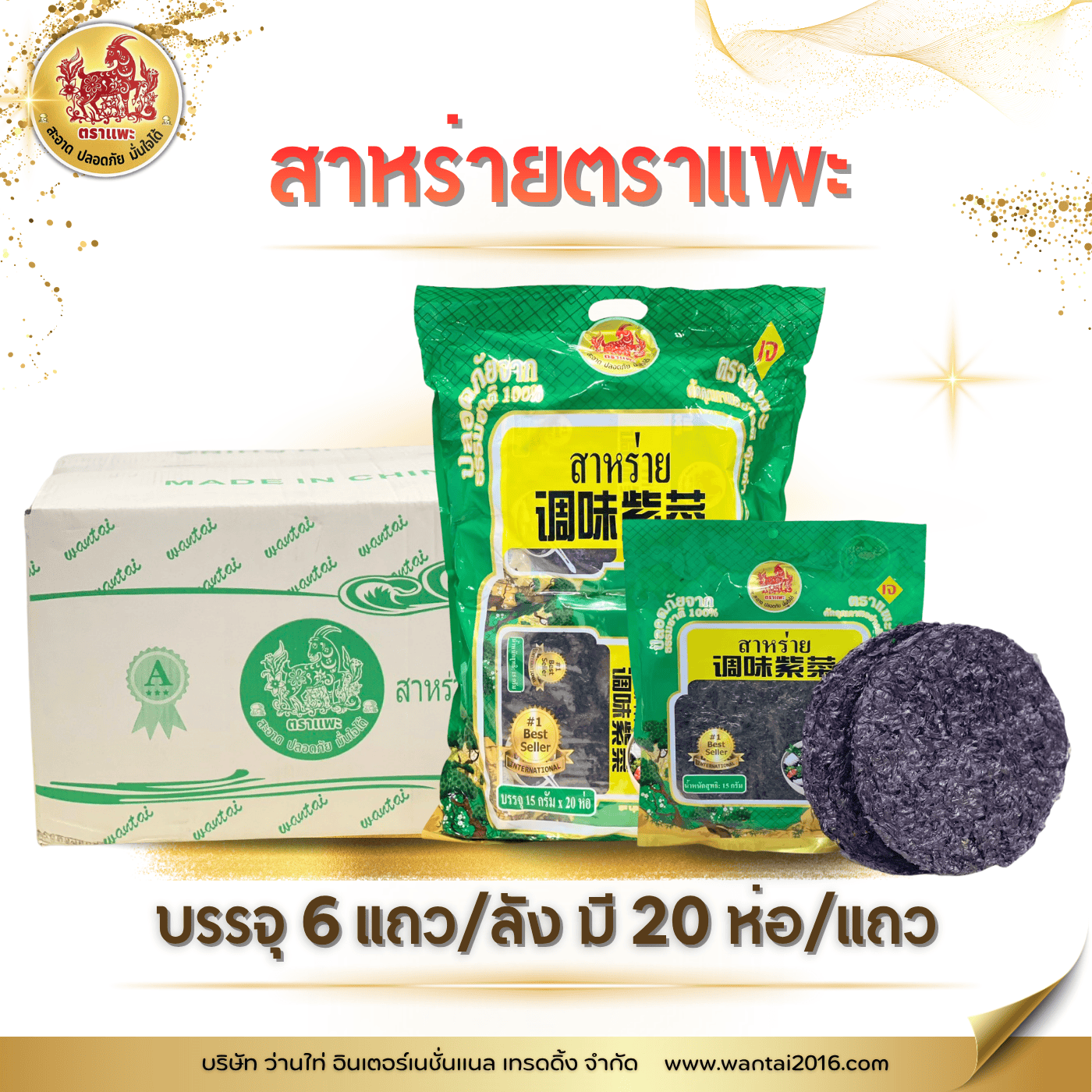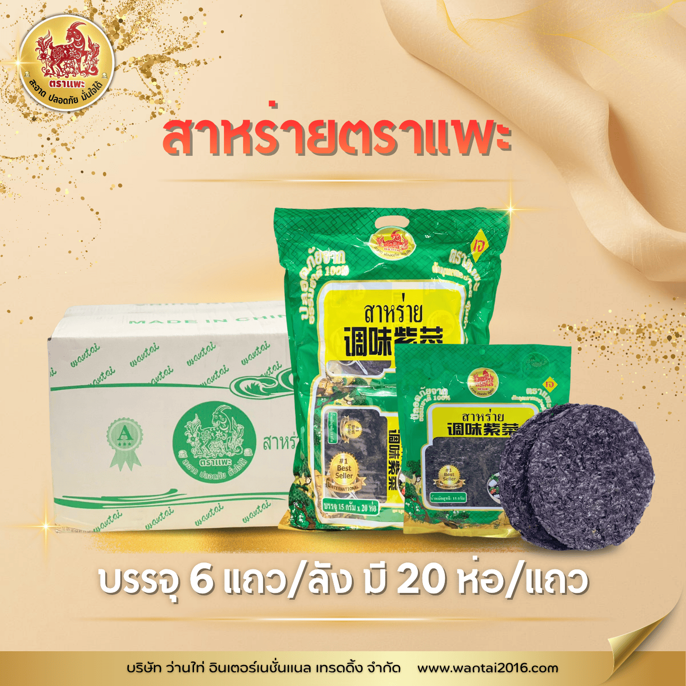 สาหร่ายตราแพะ บรรจุ 20 ห่อ/แถว ( 6แถว/ลัง ) 15g/ห่อ สาหร่ายทะเลแห้งตราแพะ แผ่นกลม สำหรับประกอบอาหาร เกรดAAA สาหร่ายชนิดกลม เหมาะสำหรับทำต้มจืด/แกงจืด หรือนำไปประกอบอาหารได้หลากหลายเมนู สรรพคุณ : สาหร่ายทะเล เป็นอาหารและขนมที่ยอดนิยมสำหรับผู้ที่ใส่ใจสุขภาพ และคุณผู้หญิงทีห่วงใยดูแลรูปร่าง เพราะเป็นอาหารที่มี ไขมัน แคลอรี่ที่ต่ำ ให้โปรตีนสูง ช่วยบำรุงสุขภาพร่างกาย และผิวพรรณ วิธีใช้ : ล้างด้วยน้ำสะอาด แล้วจึงนำไปประกอบอาหาร เช่น แกงจืด